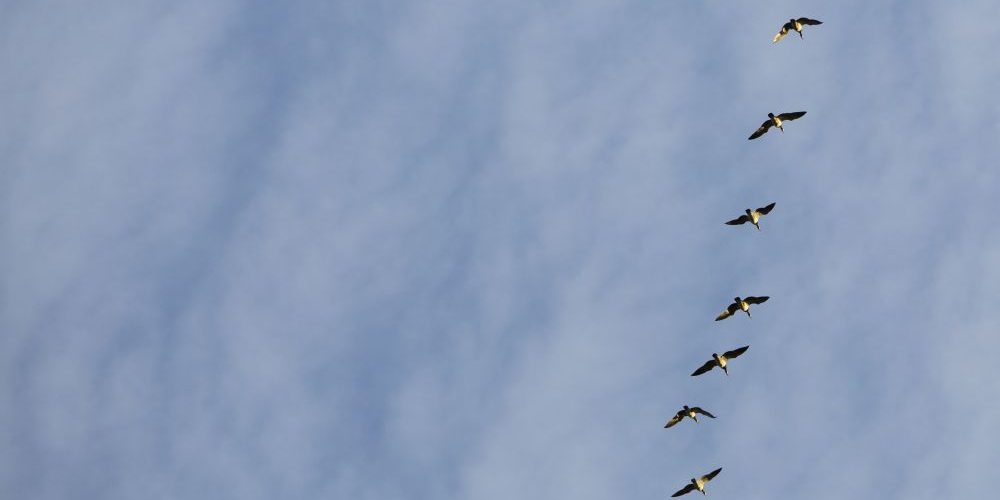 Esté donde esté me avisan con sus cantos y salgo a verlos. Iban cientos en varias formaciones en forma de “V” que van cambiando, supongo, por las corrientes de aire. No entiendo nada de ornitología, solo me llama la atención como avanzan y como se comunican entre ellas. Después de pasar varias bandadas, han llegado un par de aves solas que se habían quedado rezagadas y he observado como, a lo lejos, varios cientos volaban en círculos como esperando a las demás. Y han ido llegando otras después hasta que han considerado que era el momento, y se han puesto en camino hacia el norte.
